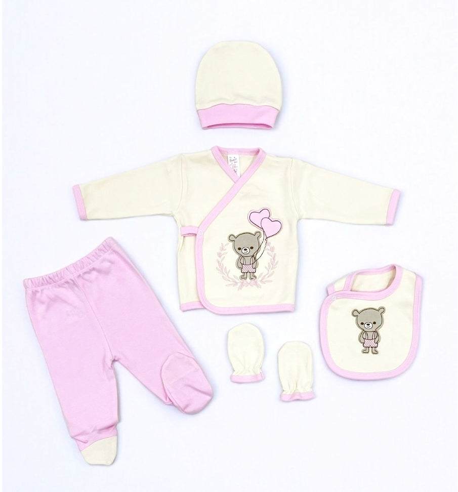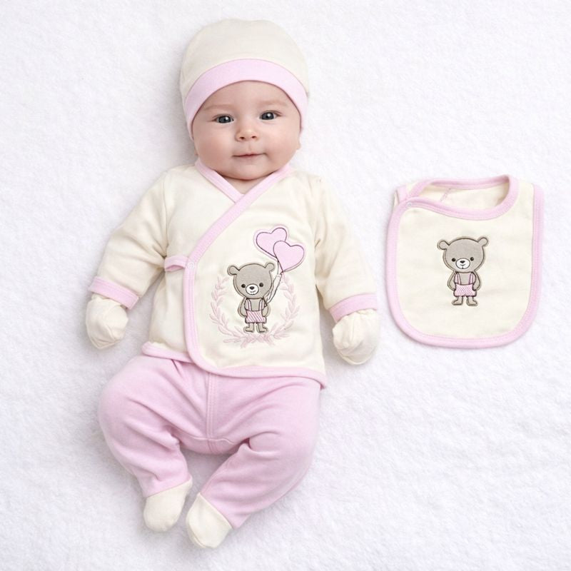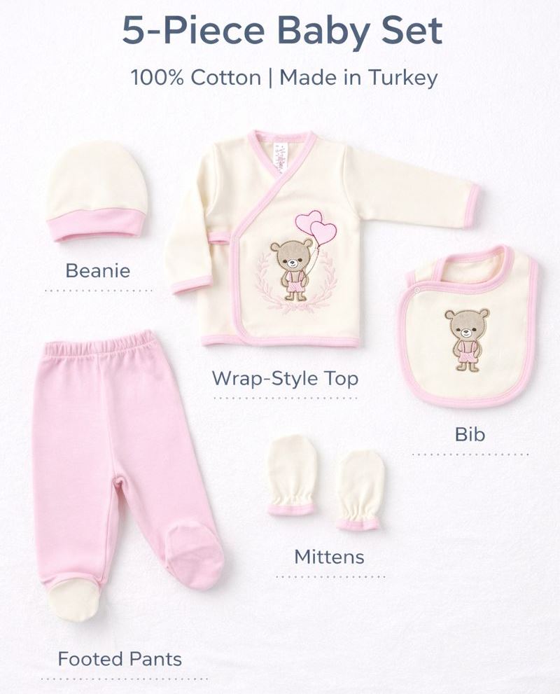 Welcome your little one to the world in style with our 5-piece baby set for girls featuring a charming bear holding a balloon design. Made for infants 0–3 months, this soft and breathable newborn outfit is crafted from 100% cotton to ensure all-day comfort for delicate skin.