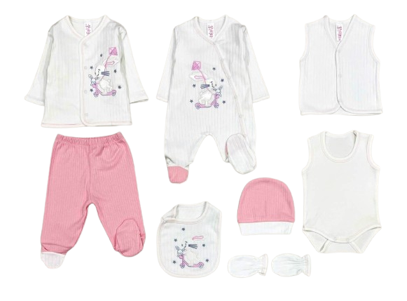 Add playful charm to your newborn's wardrobe with this 8-piece rabbit baby clothing set, featuring a fun rabbit on a scooter design. Designed for infants aged 0 to 3 months, each piece is made from 100% soft, breathable cotton, ideal for delicate skin.
