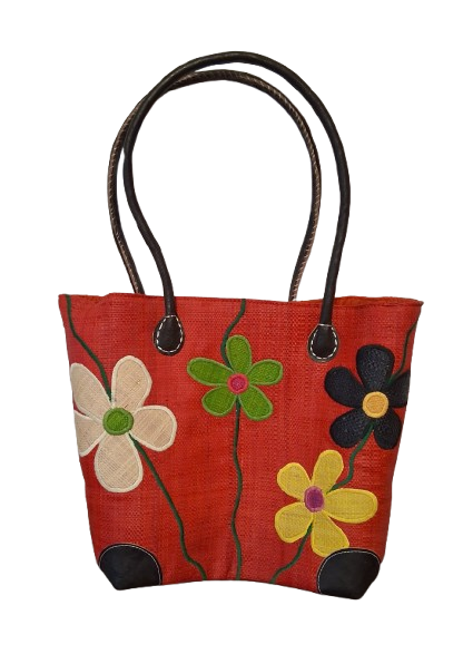 Add a touch of color and charm to your day with this medium fair trade basket, beautifully handwoven and decorated with bold, embroidered flowers. The bright red base is adorned with vibrant blooms in green, yellow, cream, and black, creating a cheerful and unique artisan look.