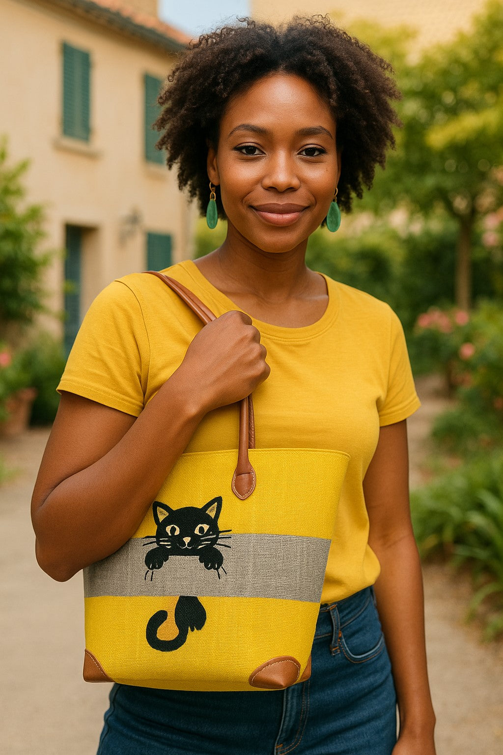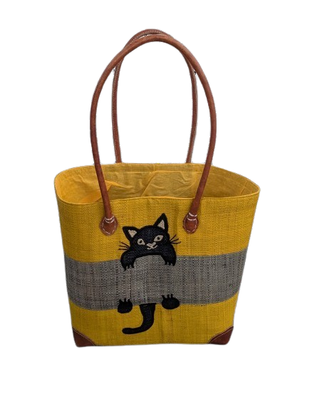 Discover our medium-sized fair trade basket, handcrafted in Madagascar with 100% natural plant fibers. Featuring a playful yellow cat design, this artisanal basket is eco-friendly, recyclable, and perfect for sustainable style and storage.