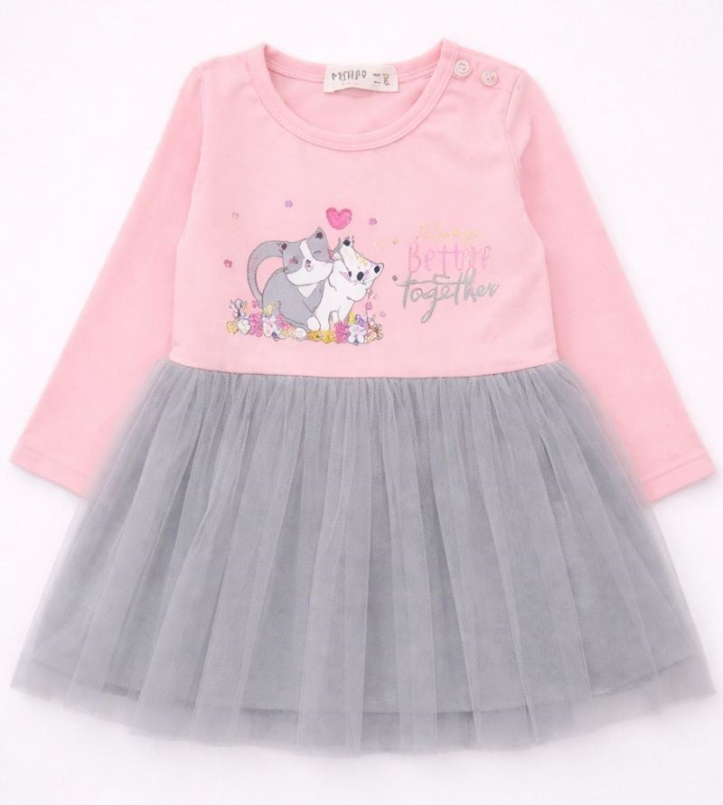 Girls Cotton Dress with Cats Print/pink and gray