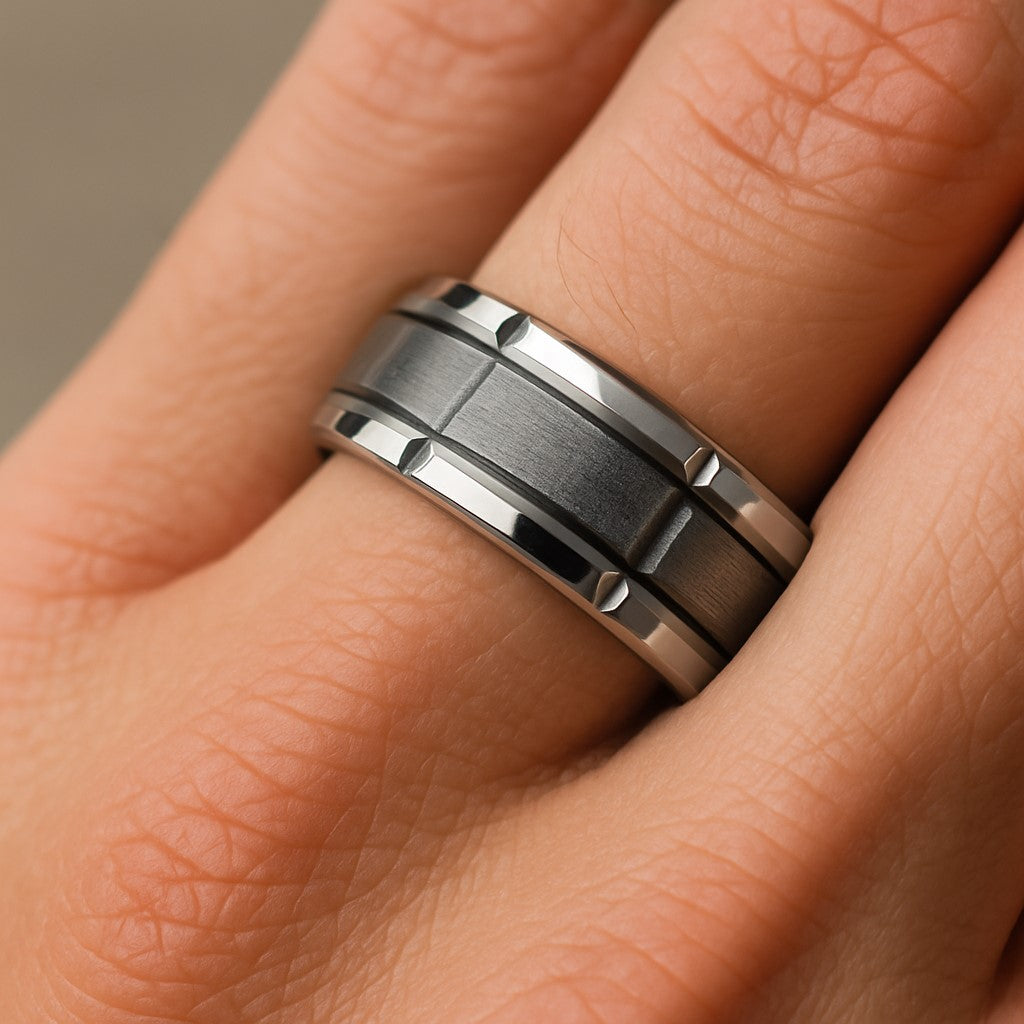 Available in sizes 9–13, it makes a bold and practical addition to your ring collection or a thoughtful gift for him.
