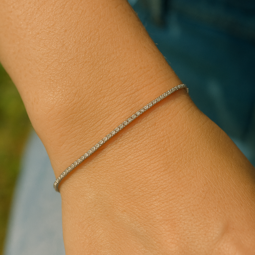 Add timeless sophistication to your look with this 925 sterling silver tennis bracelet, designed with precision and elegance. Adorned with shimmering zircon stones, this piece captures the luxurious essence of fine gold jewelry, but with the durability and shine of tarnish-resistant sterling silver.