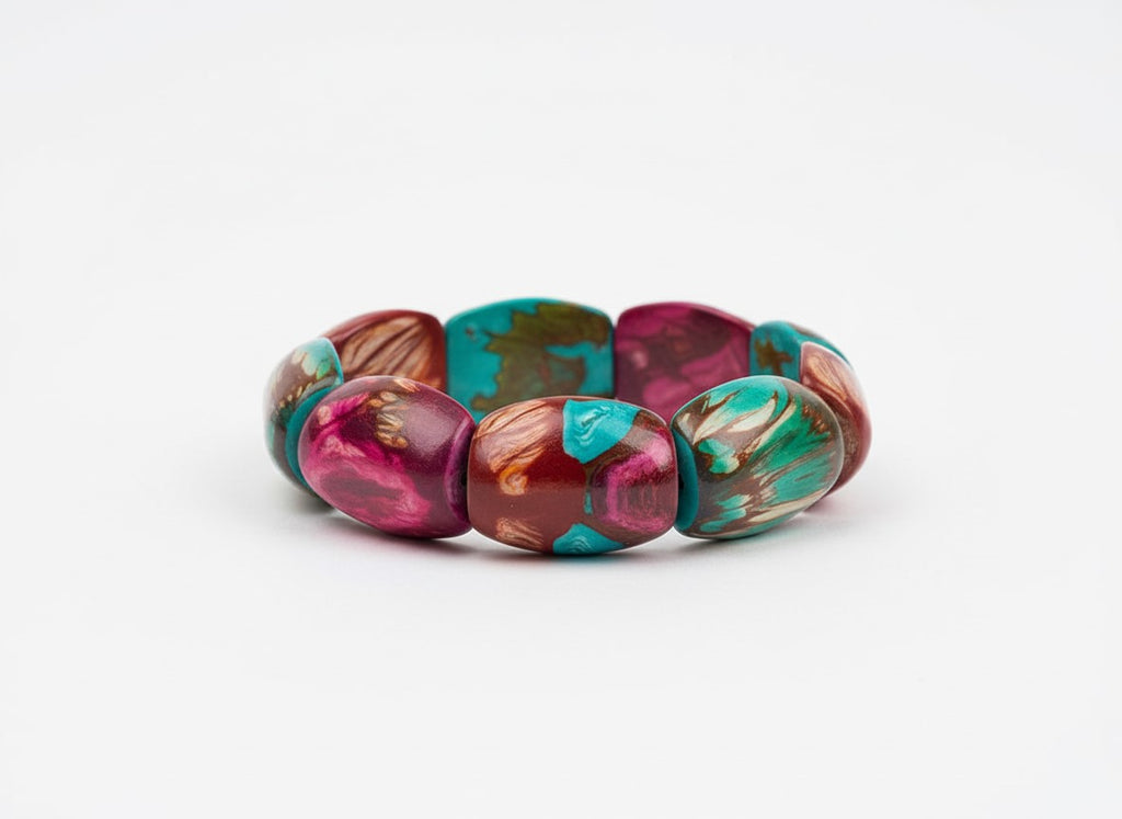 Lightweight yet durable, these vegan, biodegradable, and eco-friendly bracelets are designed with a comfortable elastic fit for all wrist sizes. Their bold shape and distinctive marbled finish make them ideal for customers looking for statement pieces that blend sustainability with artisan craftsmanship.