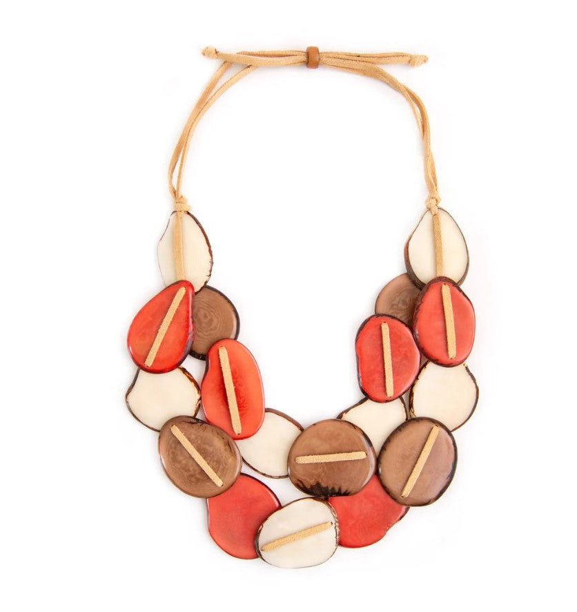 Add a vibrant touch to your look with the Belle Tagua Necklace, handcrafted in Ecuador from sustainable tagua nuts. This beautiful double-strand necklace features natural tagua pieces dyed with organic vegetable dyes, strung on a faux leather cord for comfortable wear.