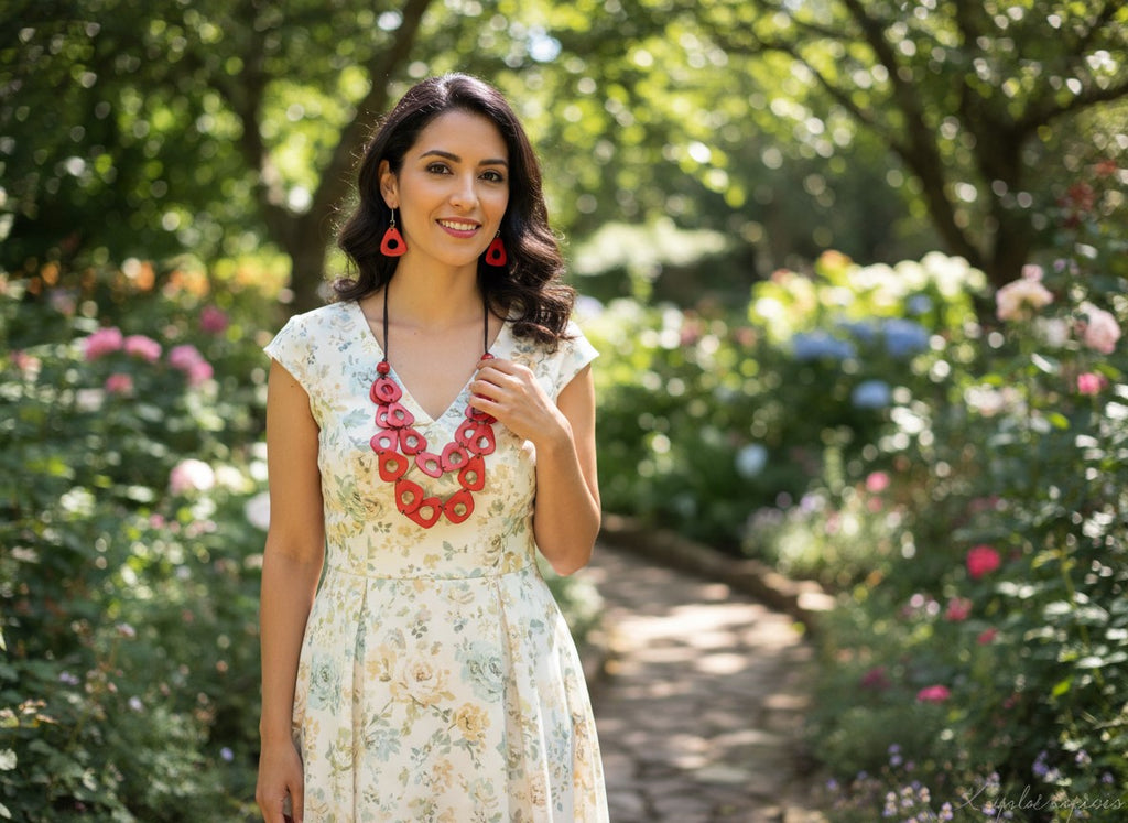This beautiful fair trade Tagua jewelry set is handcrafted from natural tagua, also known as vegetable ivory, sustainably sourced from the Ecuadorian rainforest. The necklace showcases layered, geometric tagua pieces with smooth cut-out centers, hand-dyed in a vibrant coral red tone that adds a bold yet refined touch.