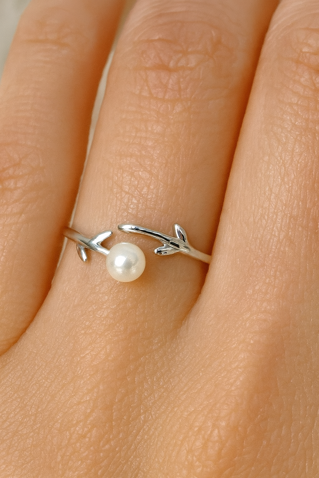 Sterling Silver Leaf & Pearl Adjustable Ring