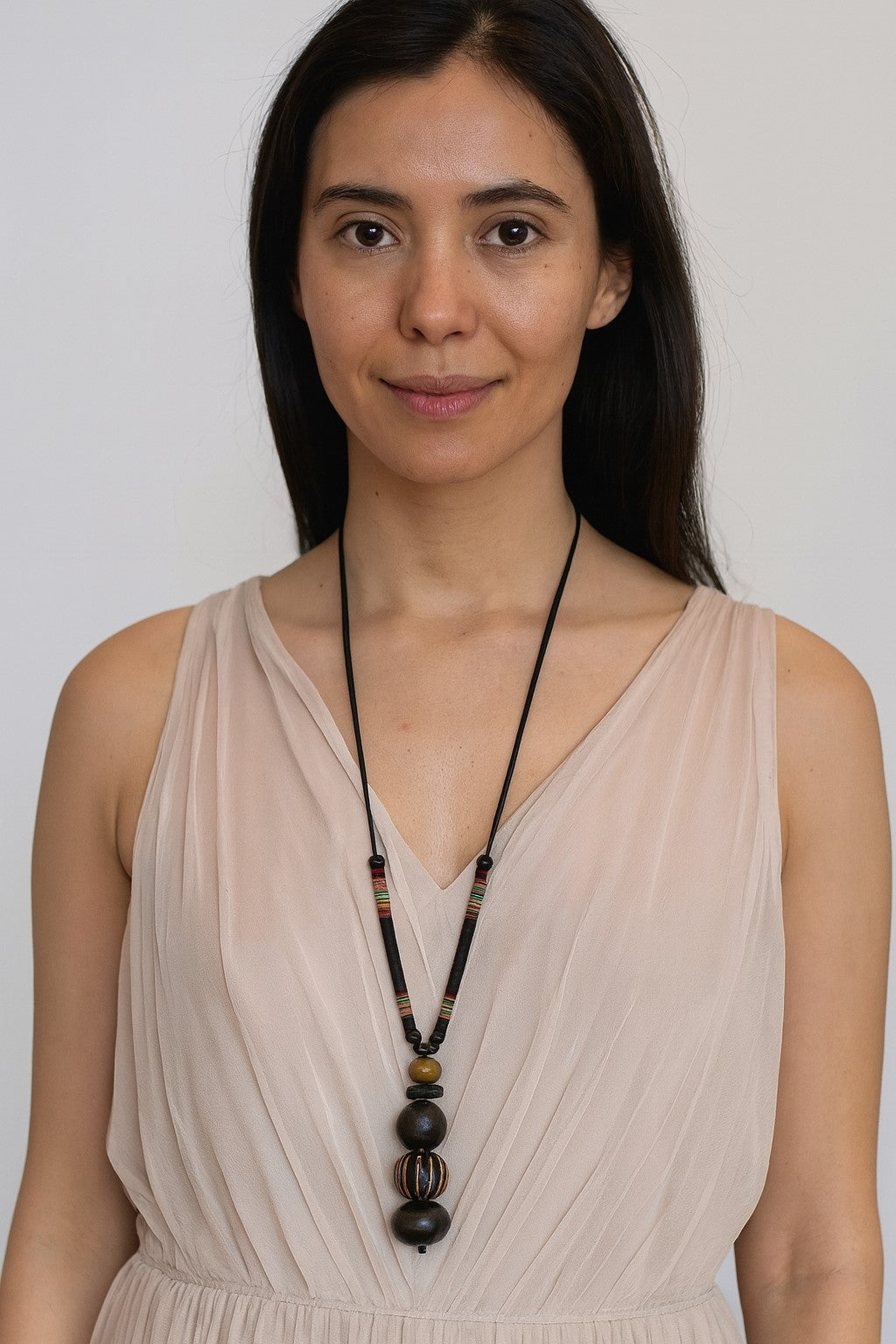 This unique African necklace blends tradition and artistry through the use of authentic Kofi beads, smooth ebony wood beads, and a piece of Bronze details. The necklace is strung on a dark cord enhanced with fine multi-color Kofi beadwork, leading down to a bold pendant arrangement. The stacked design combines earthy tones with a golden brass bead accent, creating a powerful centerpiece that reflects both heritage and contemporary elegance. Perfect as a cultural statement piece or as a distinctive everyday accessory.