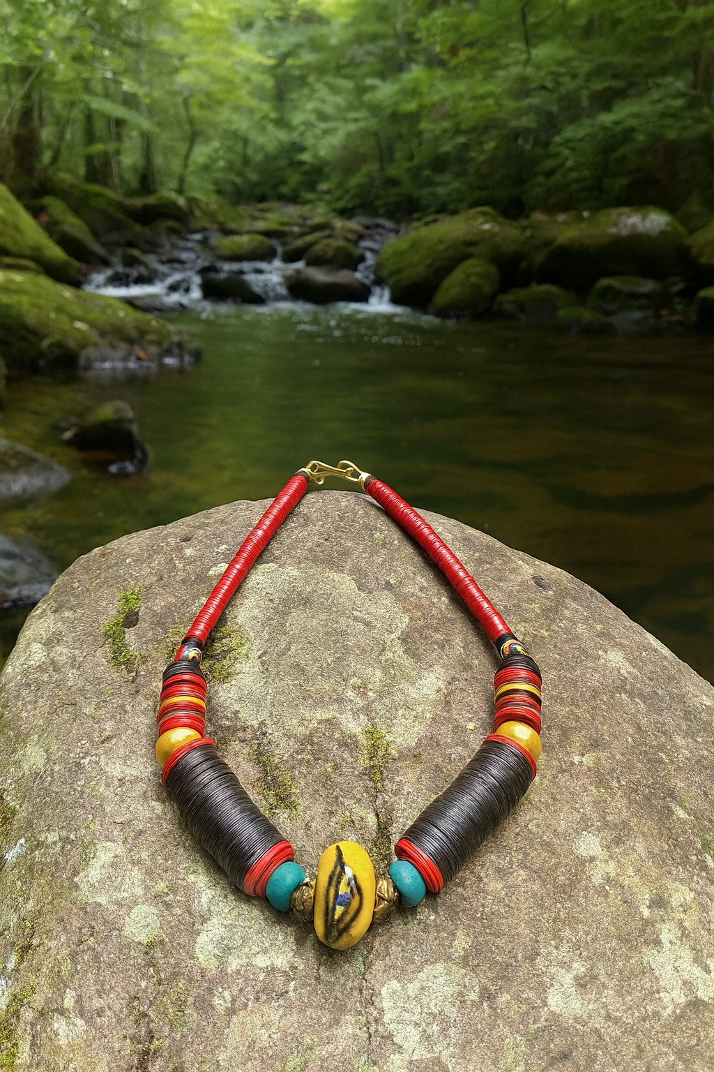 This striking handmade African necklace combines the earthy elegance of traditional Kofi disc beads with the vibrancy of colorful glass accents. The design highlights layers of red and black Kofi discs, balanced with natural yellow beads and turquoise glass details, culminating in a unique oval centerpiece with unique patterns. The piece embodies both cultural authenticity and bold artistry, making it a true statement accessory that celebrates African craftsmanship.