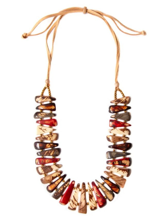 The Ursula Tagua Necklace is a bold, tribal-inspired handmade necklace crafted from sustainable Tagua nut, also known as vegetable ivory. Featuring vibrant, triangular shapes that highlight the natural grain, this fair trade accessory is ideal for lovers of eco-conscious jewelry and Tagua nut necklaces.